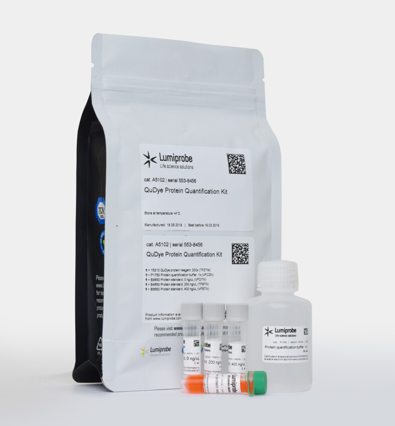 The kit includes concentrated 200x assay reagent, dilution buffer, and protein standards 0, 200, and 400 ng/uL optimized for the area of measurements. The assay has a low variability depending on the protein type and is tolerant to contaminants, such as reducing agents, nucleotides, and free amino acids DNA, but not detergents. This kit allows accurate protein quantification in the range from 12.5 µg/mL to 5 mg/mL for the initial sample (protein amount range for measuring using fluorometer: 0.25-5 µg of protein in 200 µL of the test sample). The experiment is performed at room temperature, and the signal is stable for 3 hours.